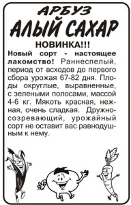 Плоды округлые, выравненные, с зелеными полосами, массой 4-6 кг. Мякоть красная, нежная, очень сладкая. Дружносозревающий, урожайный сорт не оставит вас равнодушным к нему. Свето- и теплолюбивое растение. Предпочитает песчаные, хорошо аэрированные почвы и не выносит переувлажнения. Участок должен быть защищён от ветров. Для увеличения потенциала урожайности и повышения качества плодов, не следует выращивать арбуз на одном месте более двух лет подряд, оптимально – возвращать его на прежнее место через три года. Лучшие предшественники — корнеплоды, лук, капуста. Посев производят, когда почва прогреется до 15°С на глубину 8-10 см. Перед посевом семена обрабатывают в растворе марганцовокислого калия, затем промывают чистой водой. Глубина заделки семян 1,5-2 см. При выращивании рассадным способом, для получения дружных и равномерных всходов, до появления семядолей температура воздуха должна составлять 23–27°C. Перед высадкой рассады в открытый грунт, необходимо провести ее закаливание. Рассаду высаживают, когда минует угроза заморозков, в фазе 3-4 настоящих листьев, соблюдая посадочный интервал 140х100 см в открытом грунте, в теплицах —70х70 см с использованием шпалер. Наиболее интенсивный полив следует обеспечить в период цветения и образования плодов.