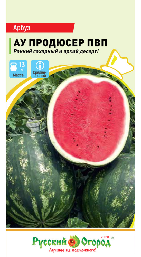Масса 10-13 кг (и более!) с красивой ярко-красной, сочной и сахарной мякотью – лучший свежий десерт!Ярче и слаще популярного Кримсон Свит, и созревает на 3-5 дней раньше.Семена мелкие.Среднеспелый урожайный сорт со сроками созревания 70-80 дней последружных всходов.Неприхотливый, отличается стабильной высокой урожайностью.Плоды овальные, светло-зеленые стемными полосами. Отлично транспортируются. Устойчив к фузариозному увяданию, ложной мучнистой росе, стеблевой гнили и антракнозу.