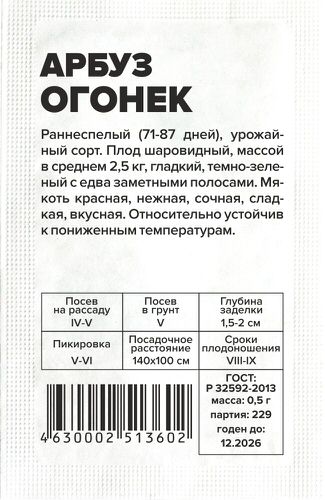 Раннеспелый (71-87 дней), урожайный сорт. Плод шаровидный, массой в среднем 2,5 кг, гладкий, тёмно-зелёный с едва заметными полосами. Мякоть красная, нежная, сочная, сладкая, вкусная. Относительно устойчив к пониженным температурам. Свето- и теплолюбивое растение. Предпочитает песчаные, хорошо аэрированные почвы и не выносит переувлажнения. Участок должен быть защищён от ветров. Для увеличения потенциала урожайности и повышения качества плодов, не следует выращивать арбуз на одном месте более двух лет подряд, оптимально – возвращать его на прежнее место через три года. Лучшие предшественники — корнеплоды, лук, капуста.