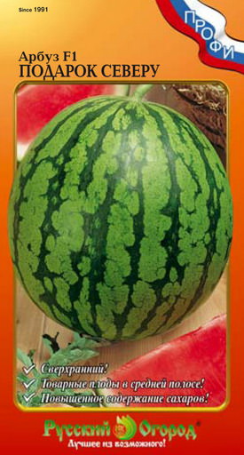 Наконец-то все могут выращивать товарные плоды арбузов в средней полосе! Сорт Подарок Северу F1 - экстраранний гибрид, в этом и есть весь его секрет. От посева до начала уборки проходит всего 75–85 дней. Плоды округлые, поверхность гладкая, масса до 10 кг! Мякоть сочная, хрустящая, с повышенным содержанием сахара. Отличается повышенной транспортабельностью, устойчивостью к болезням. Также дает высокий урожай в условиях засухи. Достаточно редкое явление в средних областях, однако, встречается!