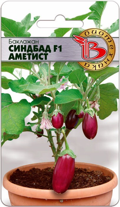 Серия Синдбад – это компактные штамбовые растения высотой 40-50 см, с ярко выраженным центральным стволиком. Внешне растение напоминает карликовое деревце. Листья некрупные, светлые, с мягким опушением, приятные на ощупь. Важная особенность – цветки собраны в кисть по 3-5 штук, что делает цветение и плодоношение растений очень эффектным и декоративным. Плоды овальные, весом 80 г, светло-фиолетового цвета. На одном растении формируется 15-18 плодов.