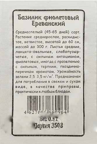 Период от полных всходов до начала хозяйственной годности около 45 дней. Крупные листья и молодые побеги имеют красно-фиолетовую окраску. Масса одного растения 300-500 г. Используют в свежем и сушеном виде в качестве пряной приправы для салатов и мясных блюд. Отличается сильным терпким вкусом и гвоздично-перечным ароматом.