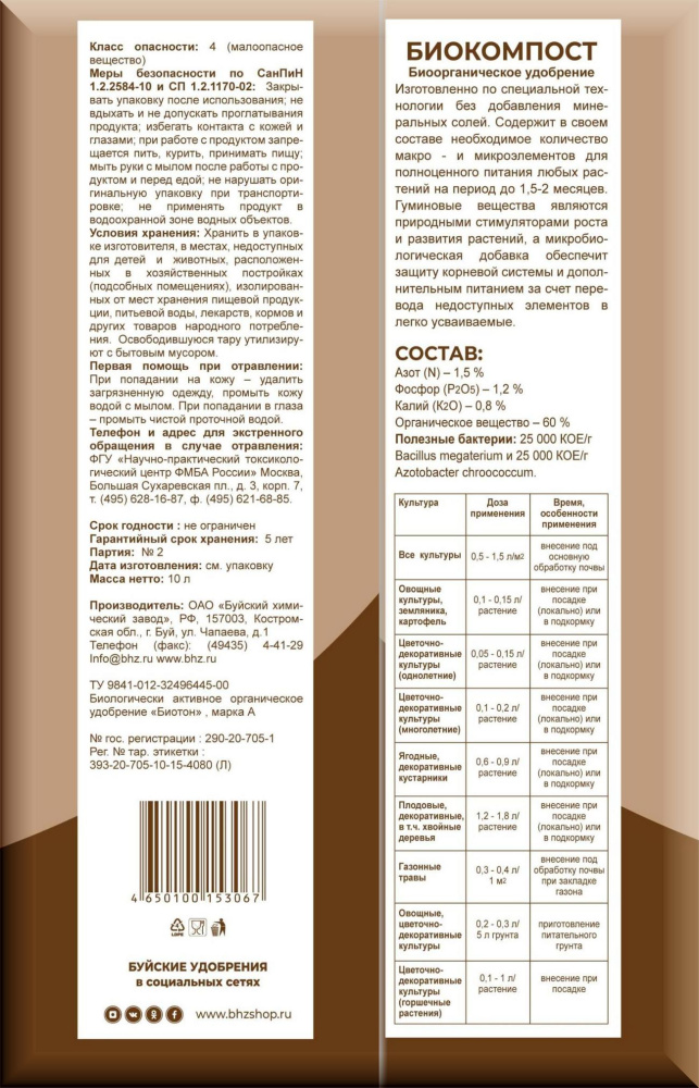 Биокомпост содержит в своем составе необходимое количество макро - и микроэлементов для полноценного питания любых растений на период до 1,5-2 месяцев. Гуминовые вещества являются природными стимуляторами роста и развития растений, а микробиологическая добавка обеспечит защиту корневой системы и дополнительным питанием за счет перевода недоступных элементов в легко усваиваемые.