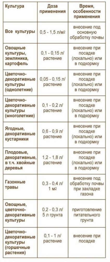 Доза применения: внесение при посадке (локально) или в подкормку - 0,1-0,2 л/растение