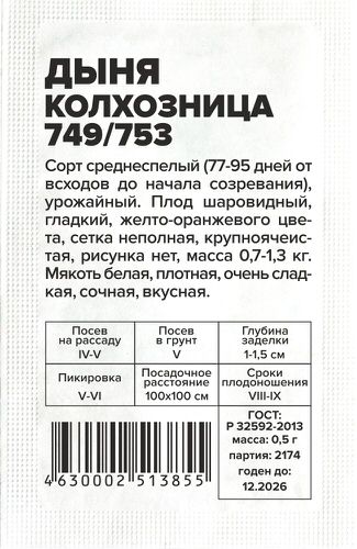 Cреднеспелый (77-95 дней от всходов до начала созревания), урожайный. Плод шаровидный, гладкий, желто-оранжевого цвета, сетка неполная, крупноячеистая, рисунка нет, масса 0,7-1,3 кг. Мякоть белая, плотная, очень сладкая, сочная, вкусная. Посев производят, когда почва прогреется на глубину 8-10 см до 15ºС.