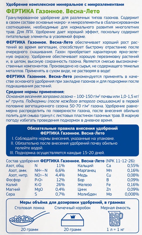 Для хорошего и дружного отрастания трав весной, граблями очищают газон от старых листьев и подкармливают из расчета 4-5 кг удобрения на 100 кв. м. Подкормку проводят сухим удобрением во влажную почву.