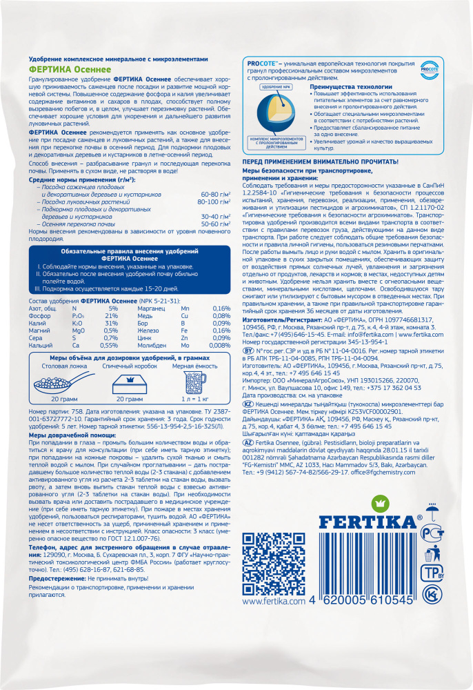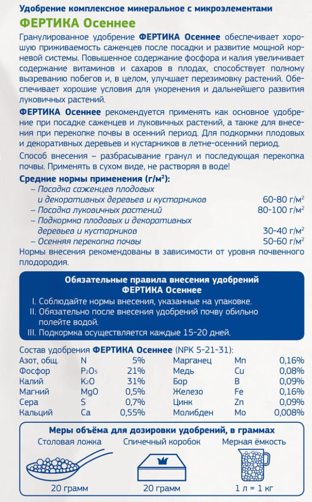 •Содержит повышенное количество фосфора и калия, которые особенно необходимы растениям в осенний период