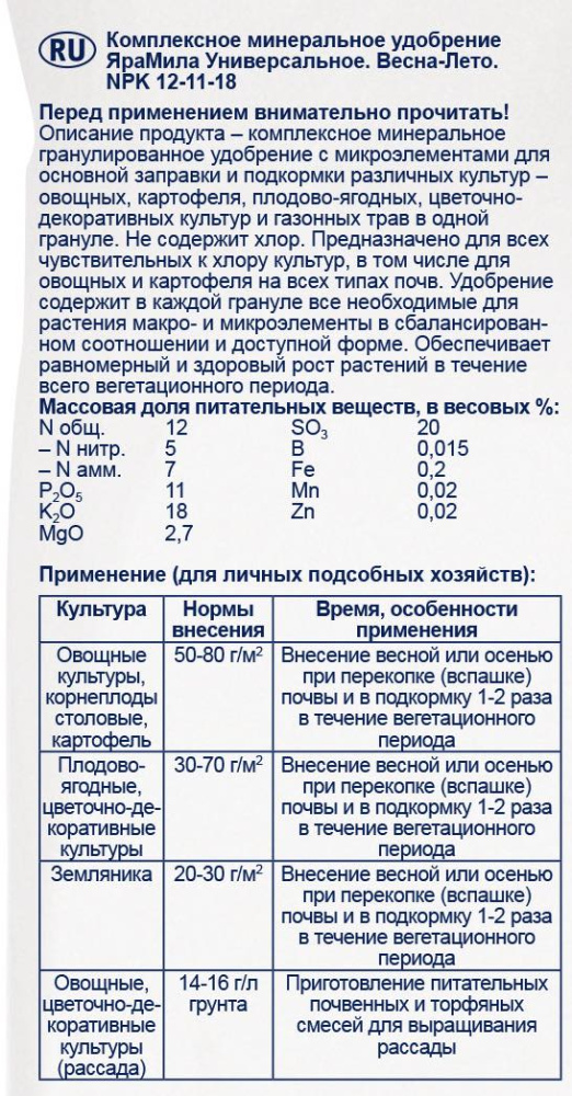 Такие гранулы позволяют сэкономить на количестве проходов при внесении удобрений; Процент использования элементов питания растениями значительно повышен за счёт высокого качества сырьевых материалов, их водорастворимости и технологии производства гранул; Удобрения не слеживаются, хорошо хранятся, удобны в применении; Наличие полифосфатов для эффективного усвоения фосфора даже на щелочных почвах; Однородный размер гранул (2-4 мм) для равномерного внесения питательных веществ в почву. Комплексное минеральное гранулированное удобрение с микро- элементами для основной заправки и подкормки различных культур - овощных, картофеля, плодово-ягодных, цветочно-декоративных культур и газонных трав в одной грануле. Не содержит хлор. NPK: N (Азот) - 12; P (Фосфор) - 11; K (Калий) - 18 .