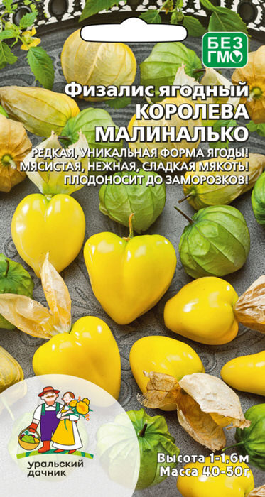 Это неприхотливое растение, с выращиванием которого справится даже неопытный дачник. Относится сорт к высокорослым культурам. Высота взрослого экземпляра варьируется в пределах 100-160 см. Значительно хорошеет кустарник в период цветения и плодоношения. Плоды созревают за 90-100 дней. Период созревания плодов, спрятанных в воздушные фонарики золотисто-бежевого оттенка, приходится на июль-сентябрь. Плодоношение растянутое. Плоды сердцевидной формы, крупные, размером с куриное яйцо, средним весом 50 г. Под тонкой кожицей кроется мясистая и сочная мякоть. Вкус у ягод достаточно сбалансированный – доминирующая сладость дополнена едва заметной кислинкой. Урожайный сорт. В среднем с одного кустарника за сезон удаётся собрать до 3 кг плодов.