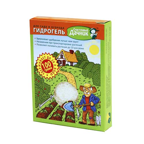 Гидрогель для сада и огорода представляет собой полимерный абсорбент впитывающий воду и при высыхании почвы, отдающий влагу растениям. Гидрогель – это высокотехнологичный продукт 21 века. Гидрогель для сада и огорода это влагоудерживающая добавка в почву. При высыхании гидрогель принимает свой первоначальный вид (кристаллический) и готов к новому циклу при последующем увлажнении. Эта способность сохраняется на протяжении трёх лет. Один грамм гидрогеля удерживает от 100 до 200 гр. воды (зависит от содержания примесей в воде). Он впитывает воду в 100 – 200 раз больше своего собственного веса.