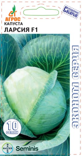 Среднеспелый высокоурожайный гибрид. Розетка листьев компактная, среднего размера. Окраска листьев темно зеленая, восковой налет сильный. Кочаны однородные, округлые, средней массой 4 - 8 кг Внутренняя структура кочана плотная. Вкусовые качества – отличные. Ларсия F1 обладает высокой толерантностью к растрескиванию, и долгое время сохраняется на корню. Благодаря крупному размеру кочанов этот гибрид можно использовать для переработки сразу же после уборки или в течение всего периода хранения (2-4 месяца).