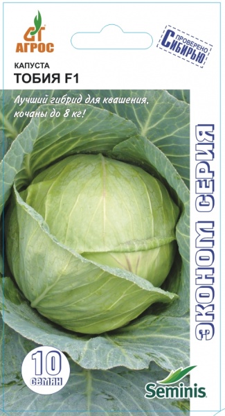 Среднеспелый гибрид. Кочаны округлые, массой 4-8 кг, внутренняя структура кочана плотная. Отличается очень хорошей урожайностью. Капуста ТОБИЯ F1 предназначена для потребления в свежем виде и переработки (особенно рекомендуется для квашения) и хранения (до 6-ти месяцев). Особенности выращивания: Посев семян на рассаду: апрель - первая декада мая. При высадке растения заглубляются до 1-го настоящего листа. Для получения высокого урожая сочетайте умеренное орошение и систематическое рыхление почвы.