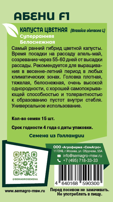 Ранний, мощный гибрид (63-75 дней после пересадки) цветной капусты. Рекомендуется для выращивания в весенне-летний период в любых климатических зонах, головки белоснежные, круглой формы, массой до 3-х кг. Универсальное использование