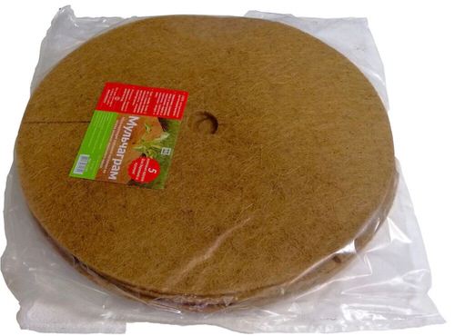 Предназначен для универсального использования круглый год на протяжении 3х лет и более: Пропускает и удерживает влагу. Защищает почву и корни растений от пересыхания. Снижает частоту полива в два раза. Природные антисептики, содержащиеся в волокнах кокосового ореха, препятствуют развитию патогенных микроорганизмов. Пористая структура мульчаграма толщиной 7 мм поздней осенью и зимой защищает корни растений от заморозков. Препятствует росту сорняков. Натуральные кокосовые волокна постепенно разлагаются, улучшая структуру почвы. Применение: разрыхлите почву вокруг ствола растения, уберите сорняки. Поместите ствол в центр круга, при необходимости увеличьте отверстие ножницами. Для сухой подкормки внесите удобрения приподняв круг над землей.