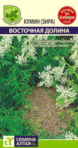 Период от всходов до созревания семян 110-1120 дней. Растение кустовое, высотой 20-50 см. Цветки бело-розовые, мелкие, собраны в зонтиковое соцветие. Молодые листья имеют пряный, слегка жгучий вкус, их используют для приготовления салатов, супов. Семена кумина обладают горьковатым, слегка ореховым запахом, усиливающийся при растирании или обжаривании. Их добавляют в соусы, маринады, в блюда из мяса и овощей, ароматизации хлебобулочных изделий.В народной медицине применяется при нарушении пищеварения, выводит шлаки из организма, тонизирует. Широко востребован в восточной кухне. Растение жаростойкое, засухоустойчивое, предпочитает рыхлые, питательные, слабощелочные почвы. Семена высевают в открытый грунт рано весной или осенью – под зиму на глубину 2,0-2,5 см. Перед посевом участок тщательно перекапывают и удобряют. Всходы появляются через 15-25 дней.