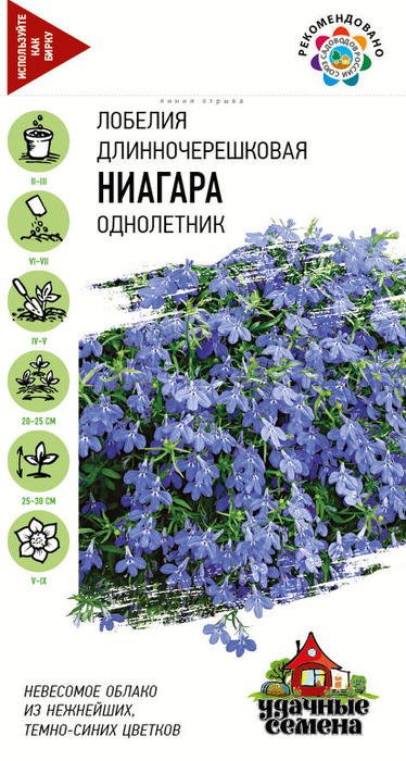 Цветки темно-синие, до 2 см в диаметре, двугубые. Цветет обильно, в течение всего сезона. Мелкие семена лобелии для равномерности смешивают с сухим песком в соотношении 1:50 и не заделывают. Оптимальная для прорастания семян температура почвы 20-22С. Лобелия хороша в вазонах, балконных ящиках и висячих корзинах, ее высаживают в саду на подпорных стенках и в бордюрах в качестве почвопокровного растения. Для большего кущения растения прищипывают.