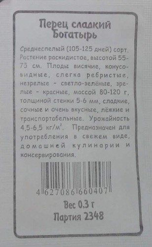 Среднеспелый (115–130 дней) сорт для открытого грунта и пленочных теплиц. Растение высотой 55–70 см. Плоды конусовидные, слегка ребристые, с толщиной стенок 5,5 мм, массой 150–160г. Окраска незрелых плодов — светло-зеленая, спелых — красная. Глубина заделки семян до 1 см.