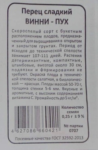 Скороспелый (107-111 дней от всходов до плодоношения) сорт для открытого грунта и пленочных укрытий.Растение низкорослое, компактное, высотой 25-30 см с букетным расположением плодов. Подходит для выращивания на окне. Для получения максимального урожая растения высаживают загущено. Плод конусовидной формы с заостренной верхушкой, массой 48-60 г. Толщина стенки 5-6 мм. Окраска в технической спелости салатная, в биологической красная. Урожайность 1,6-1,8 кг/м2.