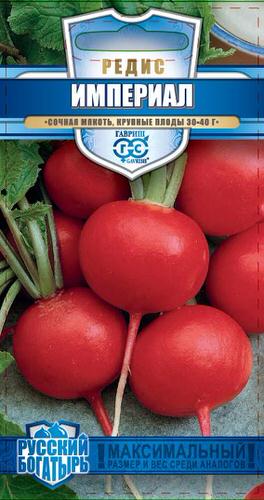 Это сочный, приятный на вид плод со сладковатой остротой, богат клетчаткой и витаминами. Сорт среднеспелый, через 25-30 дней можно собирать первый урожай очень крупных корнеплодов. Красные плоды имеют округлую форму диаметром 8-10 см и массой 30-40 г, с белой, хрустящей мякотью. Вкусовые качества отменные. Используют в свежем виде: нарезке, салатах, окрошке. Из редиски готовят закуски, бутерброды. Сорт относительно устойчив к болезням. Посев в грунт проводится в конце апреля-начале мая, июле на глубину 1 см по схеме 5-7x15 см. Урожайность 3,2-3,4 кг/м2.