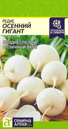 Позднеспелый сорт. Корнеплод эллиптический, массой 50-90 г., белый. Мякоть белая, нежная, с хорошим вкусом. Использование в осенне-зимний период, сохранность в хранилище до 5 месяцев. Под выращивание редиса отводят рыхлые, плодородные, супес-чаные или легкосуглинистые почвы. На бедных, тяжелых и кислых почвах хороший урожай высокого качества не вырастает. Редис требователен к свету, в тени дает длинную ботву и маленький корнеплод. Для получения максимального урожая редиса необходимо строгое соблюдение севооборота — не сажать его после крестоцветных. Возможны смешанные посевы редиса с морковью и луком. Посев проводят с начала апреля до середины августа. Семена всходят при температуре 16-18°C на 5-6 день.