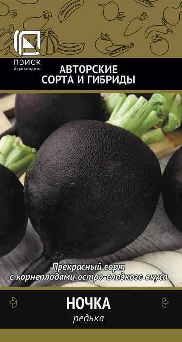 Прекрасный сорт для летне-осеннего оборота. Период от всходов до уборки урожая 70-80 дней. Корнеплод черный, округлый, длиной 8-12 см, диаметром 9-13 см. Поверхность слегка бороздчатая. Мякоть белая, плотная, сочная, остро-сладкого вкуса. Масса 230-350 г. В почву погружен полностью, легко выдергивается. Розетка полураскидистая. Отлично хранится.