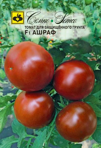 От всходов до созревания 90-95 дней. Растение со средними междоузлиями, хорошо облиственное. Первое соцветие закладывается над 7-9 листом. Помидор округлый, массой 140-150 г, тёмно-коричневый, гладкий, плотный. Мякоть плода на разрезе тёмно-вишнёвой окраски, с повышенным содержанием ликопина. При высоких температурах в летний период помидоры приобретают красно-коричневую окраску. Хорошая завязываемость при высоких температурах. Вкус отличный. Товарность и транспортабельность хорошие. Томат Ашраф F1 устойчив к вирусу томатной мозаики (TоMV), вертициллёзу (Va,Vd) и фузариозу (Fol 1-3). Для потребления в свежем виде. Выращивается в плёночных теплицах или в открытом грунте на шпалере. Густота посадки 2,5-3 раст./м2. Урожайность свыше 20 кг/м2.