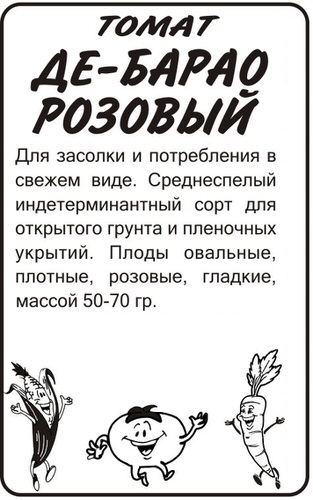 Среднеспелый индетерминантный сорт для открытого грунта и пленочных укрытий. Плоды овальные, плотные, розовые, гладкие, массой 50-70 г. Идеален для засолки и потребления в свежем виде.