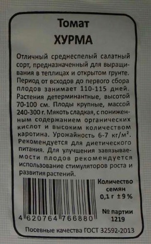 Томат Хурма детерминантный, невысокий, среднеспелый сорт. Вегетативный период – 109-120 дней. Куст, при выращивании в открытом грунте достигает 80 сантиметров, в теплице вырастает до 100 сантиметров.