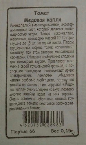 Высокорослый сорт для выращивания в открытом грунте и пленочных теплицах. Плоды каплевидной формы, гладкие, медового цвета, массой 30 г, с приятным сладковатым вкусом и нежным томатным ароматом. Из сорта Медовая капля получаются аппетитные и яркие свежие салаты, соленья, маринады, вкусные закуски и канапе. Посев на рассаду — в марте–начале апреля. Пикировка рассады в фазе первого настоящего листа. Посадка рассады в грунт — начало–середина мая или конец мая–начало июня. Растение требует пасынкования и подвязки. Семена после уборки сохраняют всхожесть в течение 10 лет при оптимальных условиях хранения. Рекомендуется увеличить норму высева по истечении срока годности.