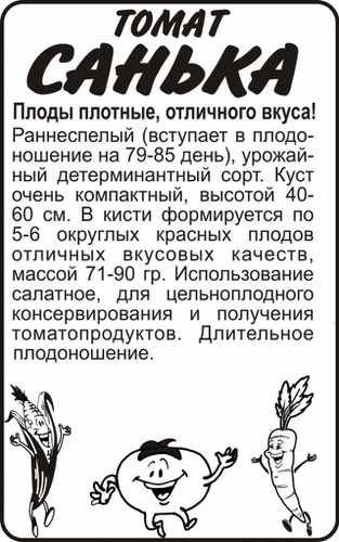 Раннеспелый (вступает в плодоношение на 79-85 день) урожайный сорт. Растение детерминантное, куст очень компактный, высотой 40-60 см. В кисти формируется по 5-6 округлых красных плодов отличных вкусовых и товарных качеств, массой 71-90 г. Использование салатное, для цельноплодного консервирования и получения томатопродуктов. Сорт характеризуется длительным периодом плодоношения.