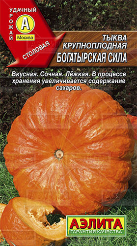 Столовый сорт с плодами высокого качества. Среднеспелый, от всходов до уборки 100-110 дней. Растения длинноплетистые. Тыквины массой 4-6 кг, максимально – до 15 кг. Мякоть хрустящая, толстая, сочная. Семена крупные, белые. Плоды лежкие, хранятся до четырех месяцев.