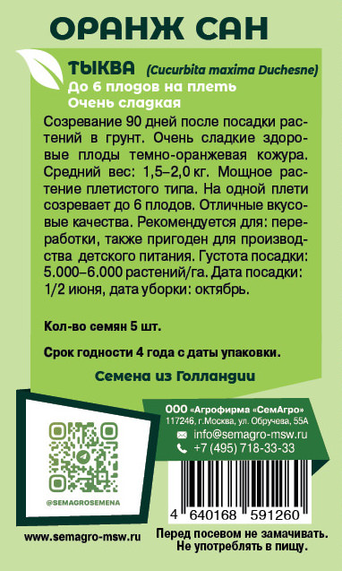 Оранжевое солнце. Мякоть насыщенно-жёлтая, крахмалистая, плотная, малосочная, хорошего сбалансированного вкуса. Отлично хранится в течение 120-130 дней после съёма. Растение кустовое, не испытывает особого дискомфорта от капризов погоды.