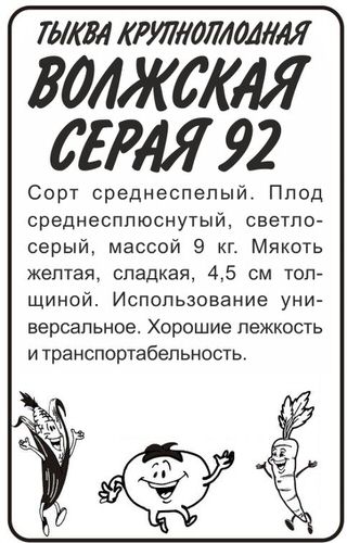Плод среднесплюснутый, светло-серый, массой 9 кг. Мякоть желтая, сладкая, 4,5 см толщиной. Использование универсальное. Хорошие лежкость и транспортабельность. Требовательна к плодородию почвы и освещению. Лучшие почвы — супесчаные и легкосуглинистые, слабокислые или нейтральные, с глубоким пахотным слоем. Отзывчива на внесение перегноя. Семена высевают в открытый грунт по 2-3 штуки в лунку, когда минует угроза заморозков. Глубина заделки семян 3-5 см, на легких почвах до 7 см. Для нормального вызревания на растении оставляют по 2-4 завязи, а плети прищипывают. Плоды убирают в полной спелости вместе с плодоножкой.