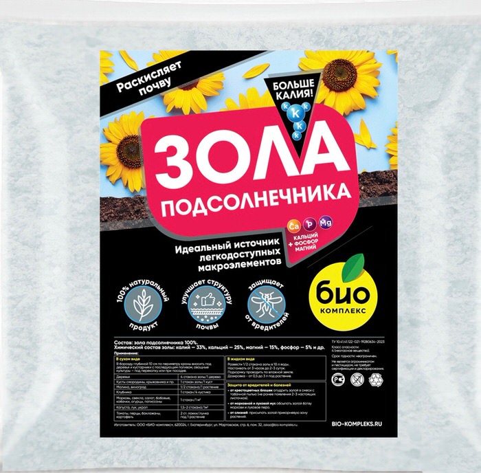 Но зола разных растений обладает различным соотношением питательных веществ. Наиболее ценной по составу является зола подсолнечника. В ней гораздо больше важнейшего макроэлемента КАЛИЯ, чем в обычной древесной золе. Сравните: в золе подсолнечника калия 33%, тогда как в древесной золе около 13%.